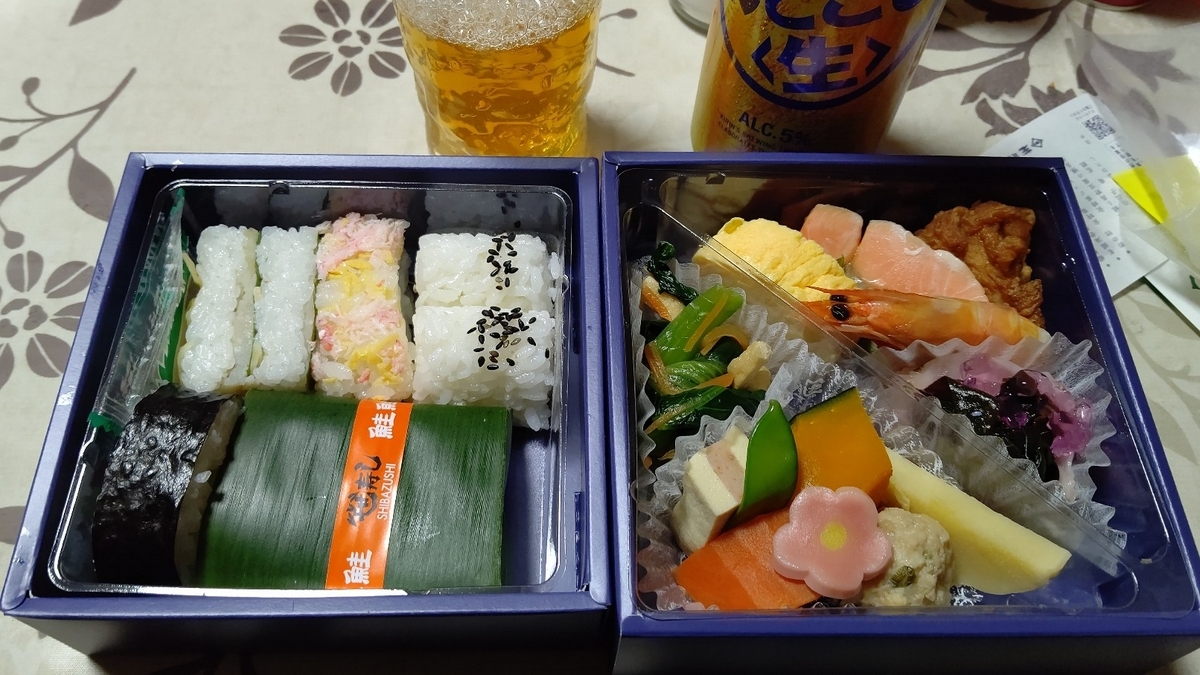 まずはイオンで買ってきた弁当と、足りんし握り寿司です(*^^*)